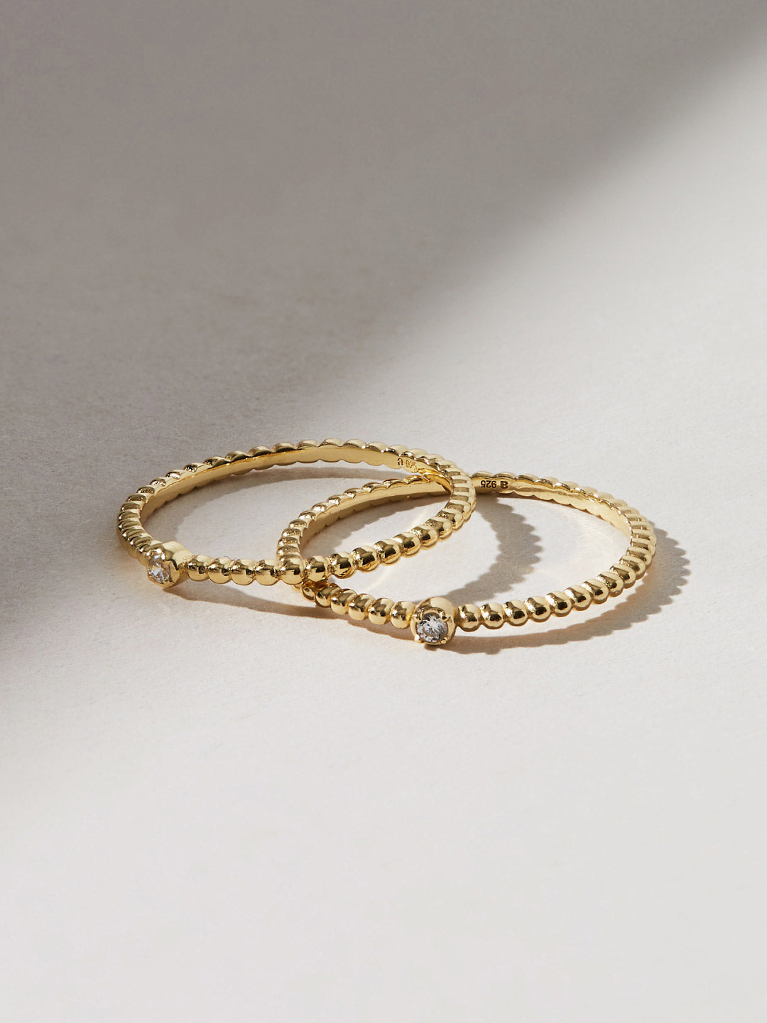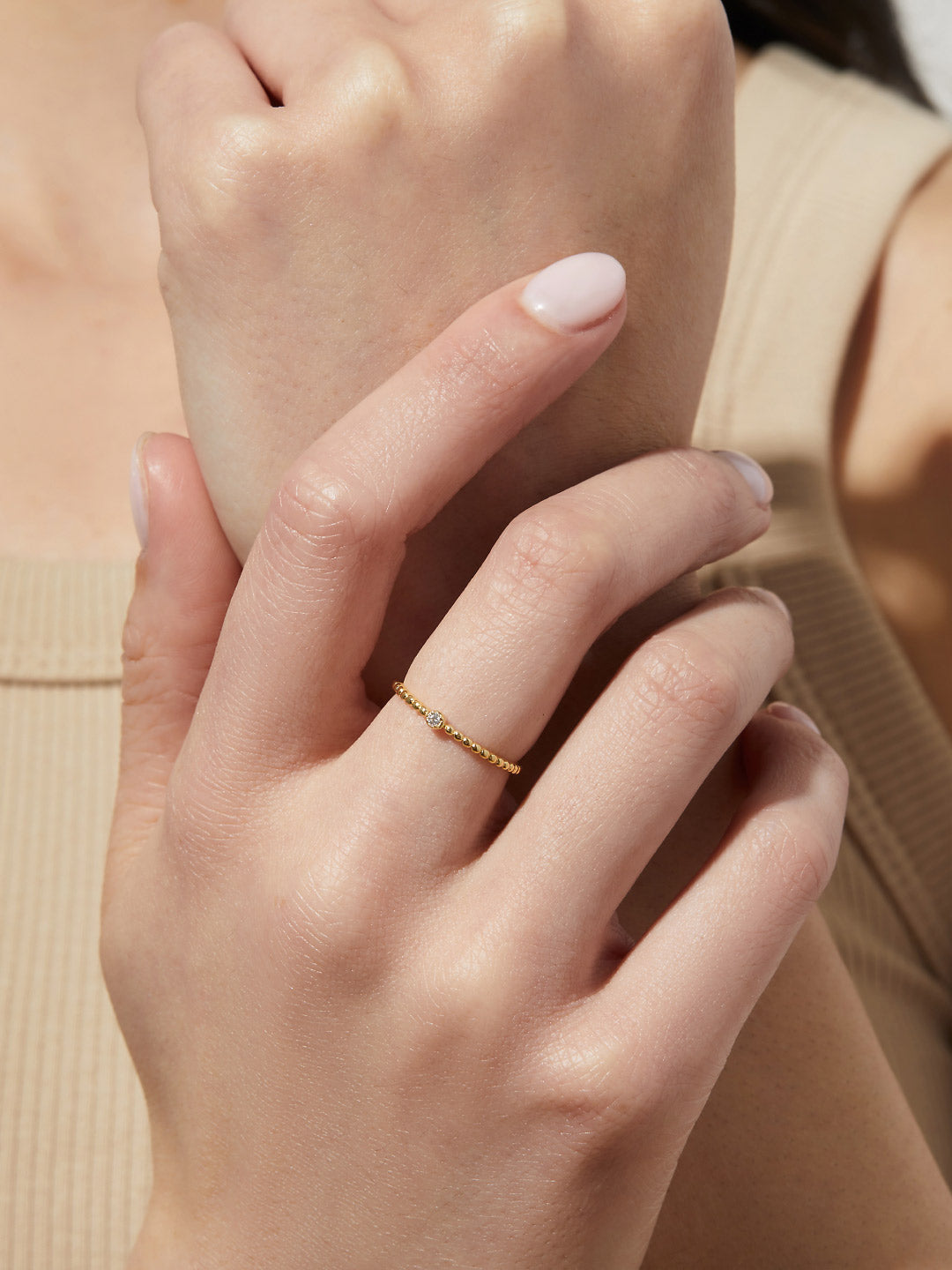 The perfect stacking ring does exist, and it just so happens to be this beaded stone ring. This dainty, beaded ring is crafted in sterling silver, dipped in a layer of 14K gold, and perfectly displays a 1.5 mm cubic zirconia gemstone for a touch of sparkle. Wear this beaded stone ring with your favorite rings for an eye-catching stack.