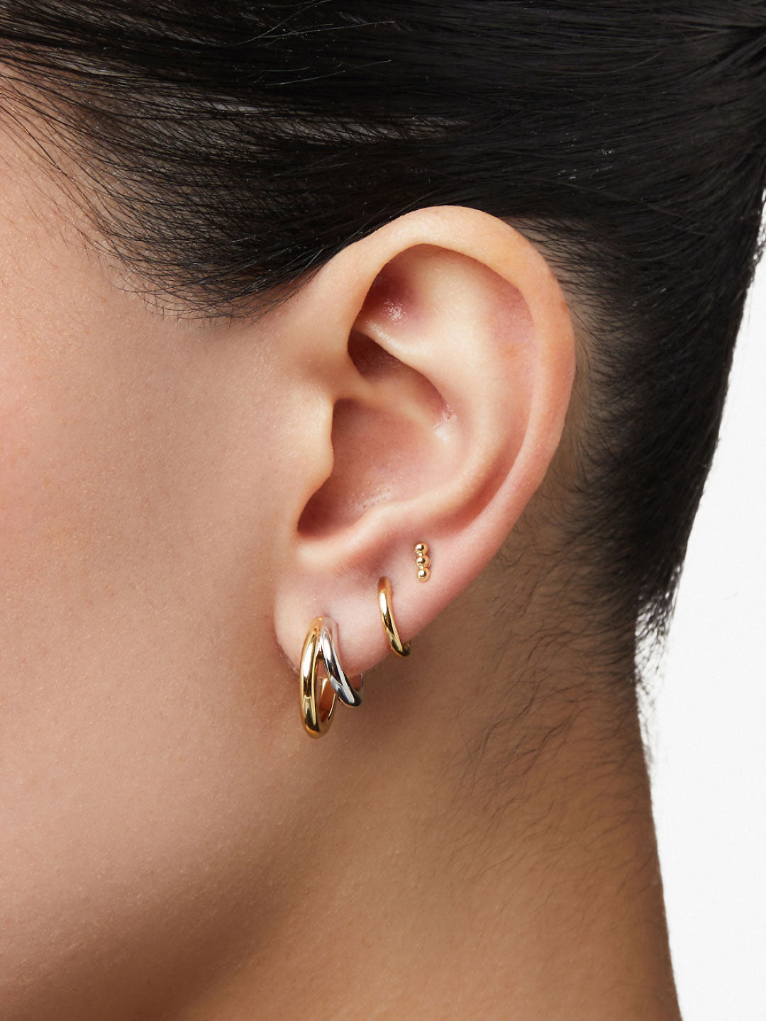 The Double Take Bundle includes three pieces: Double Hoop Earrings - Scarlett Two Tone, Sterling Silver - Mini Huggie Hoops, and Triple Bead Studs - San. This is not a gift set. Gift packaging is not included but can be sold separately.