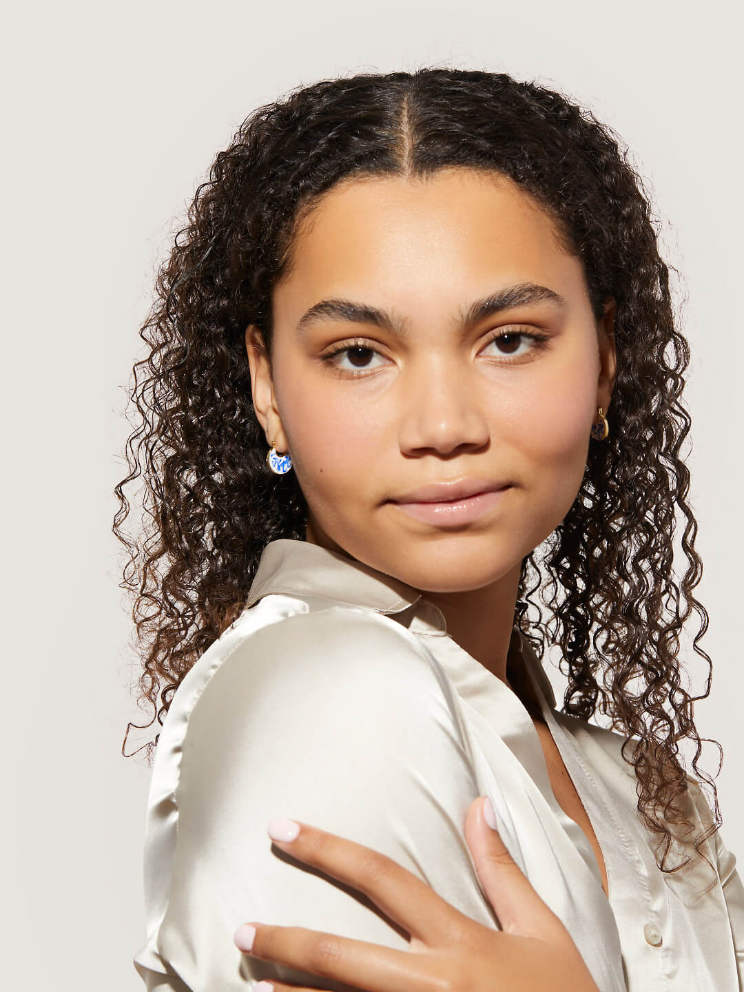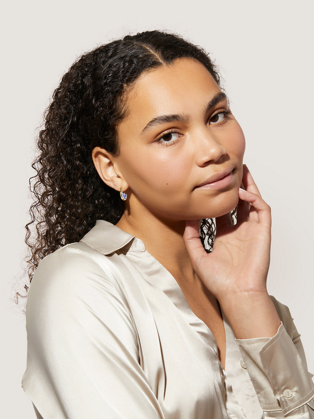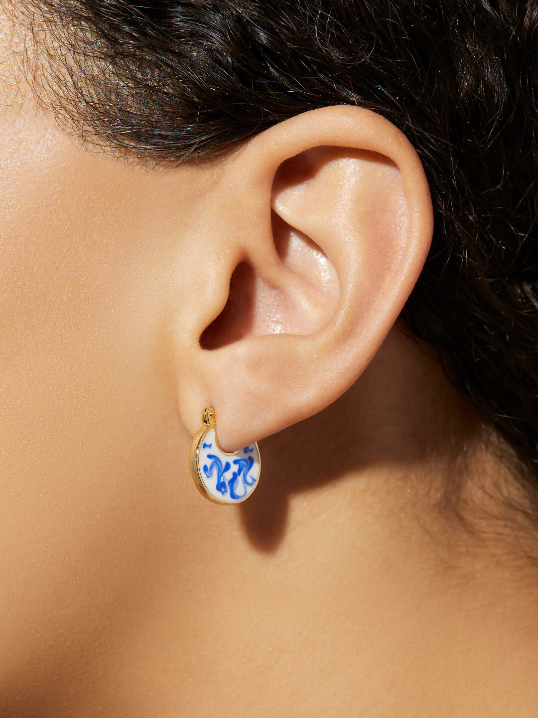 We’re all eyes on enamel earrings—especially when they come with a completely unique design. These disc hoop earrings are dipped in a layer of 14K gold and painted with an artful blue and white design. Wear these enamel earrings with some of our other blue pieces for a true blue look. Looking for something bigger? Try our original Hana Marble Blue earrings.