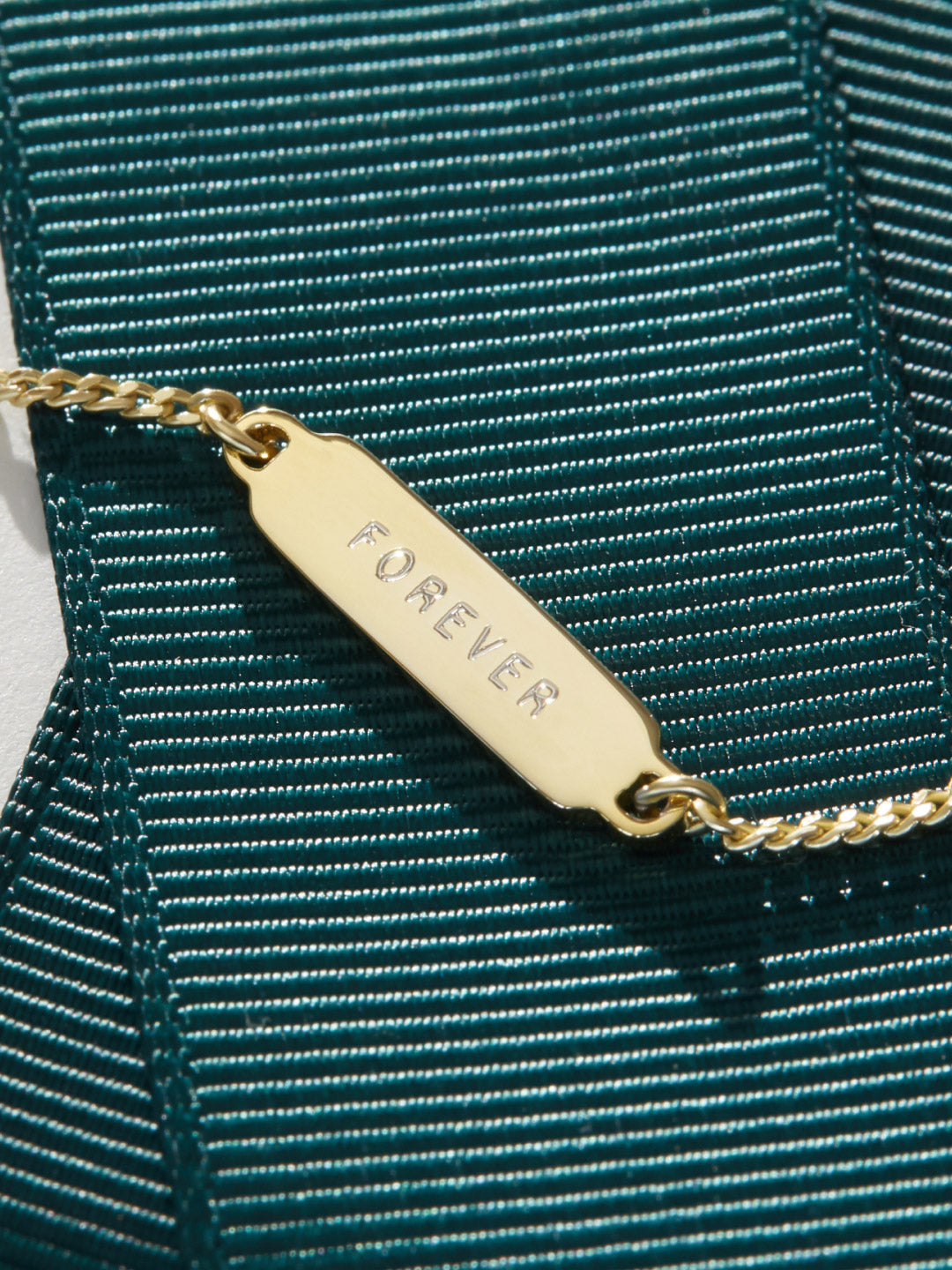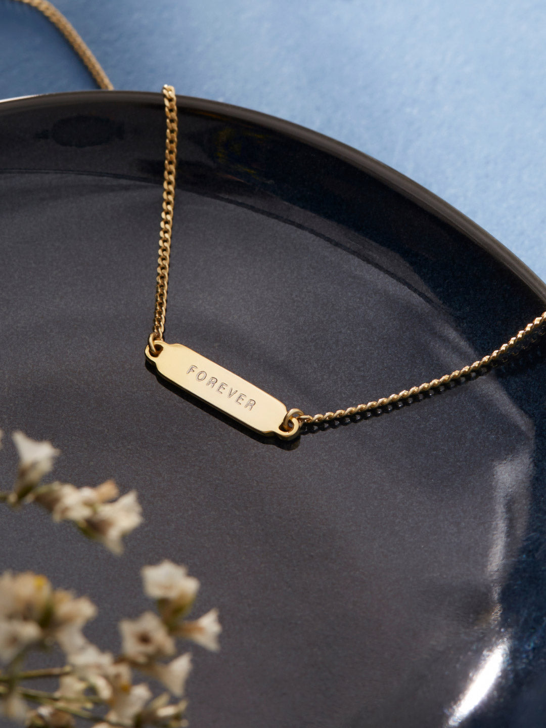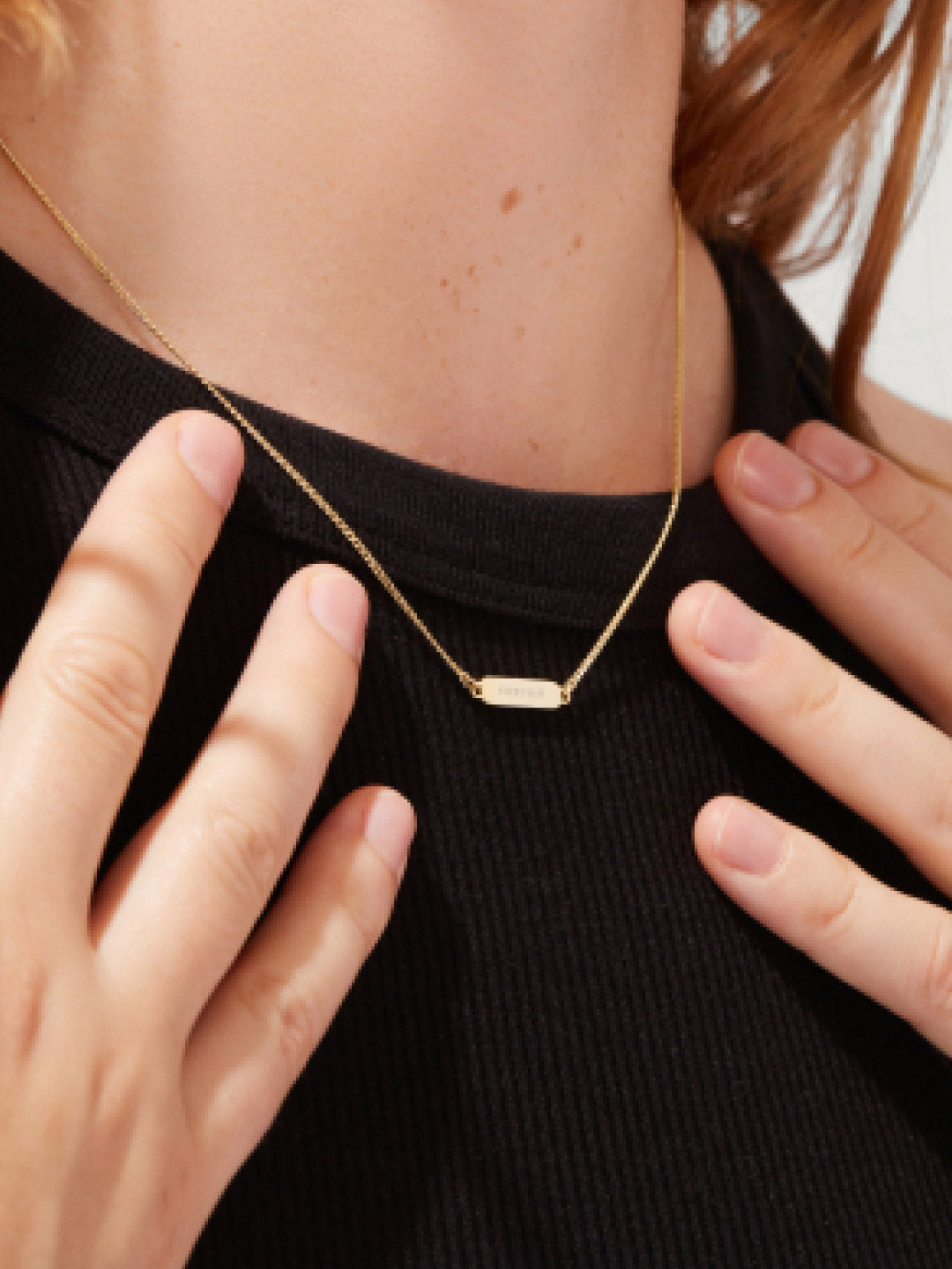 The modern-day, engravable gold bar necklace is the ultimate symbol of chic with its dainty link chain and customizable gold bar pendant. Carefully crafted in recycled Sterling Silver and coated with a 14K gold layer, this engravable gold bar necklace is a must-have jewelry staple. Engrave this personalized necklace with a custom monogram or meaningful message to wear a truly unique jewelry piece. *Please note that due to the metals used, engraving color will be slightly silver.*