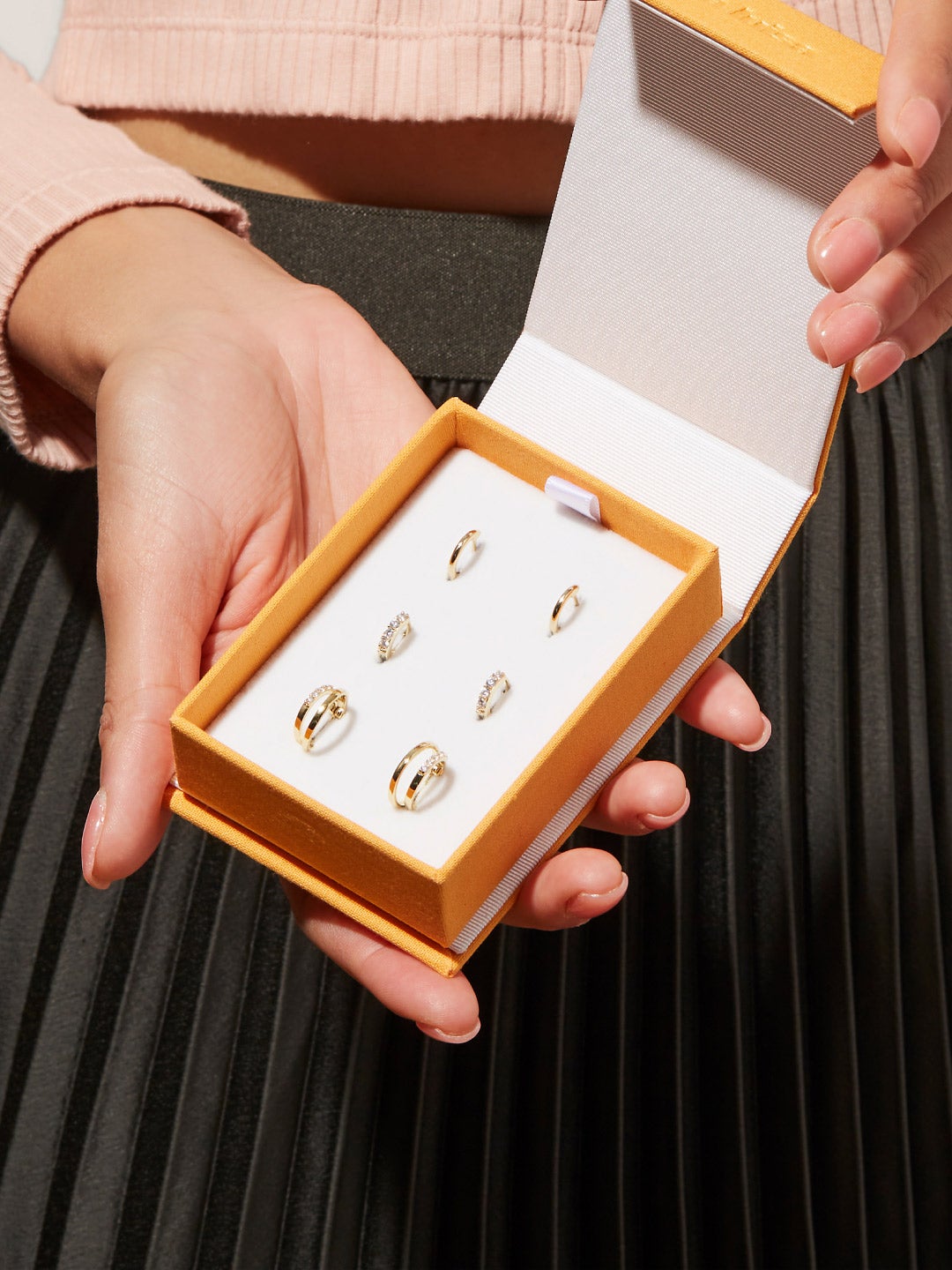 If there's anyone on your life right now who can't get enough of stackable and dainty gold earrings, this exclusive essentials gift set is for them! Featuring our best selling Mini Huggie Hoops, Suzanne and Toda earrings, all the pieces are crafted in recycled Sterling Silver. This essentials gift set is the perfect present for earrings and styling fanatics alike. Get these three staples from Ana Luisa today in an chic pre-boxed set at an exclusive price!