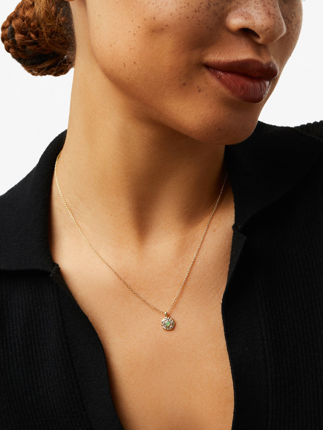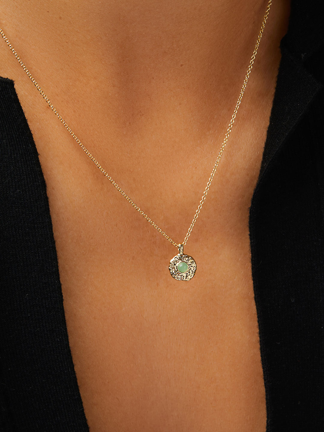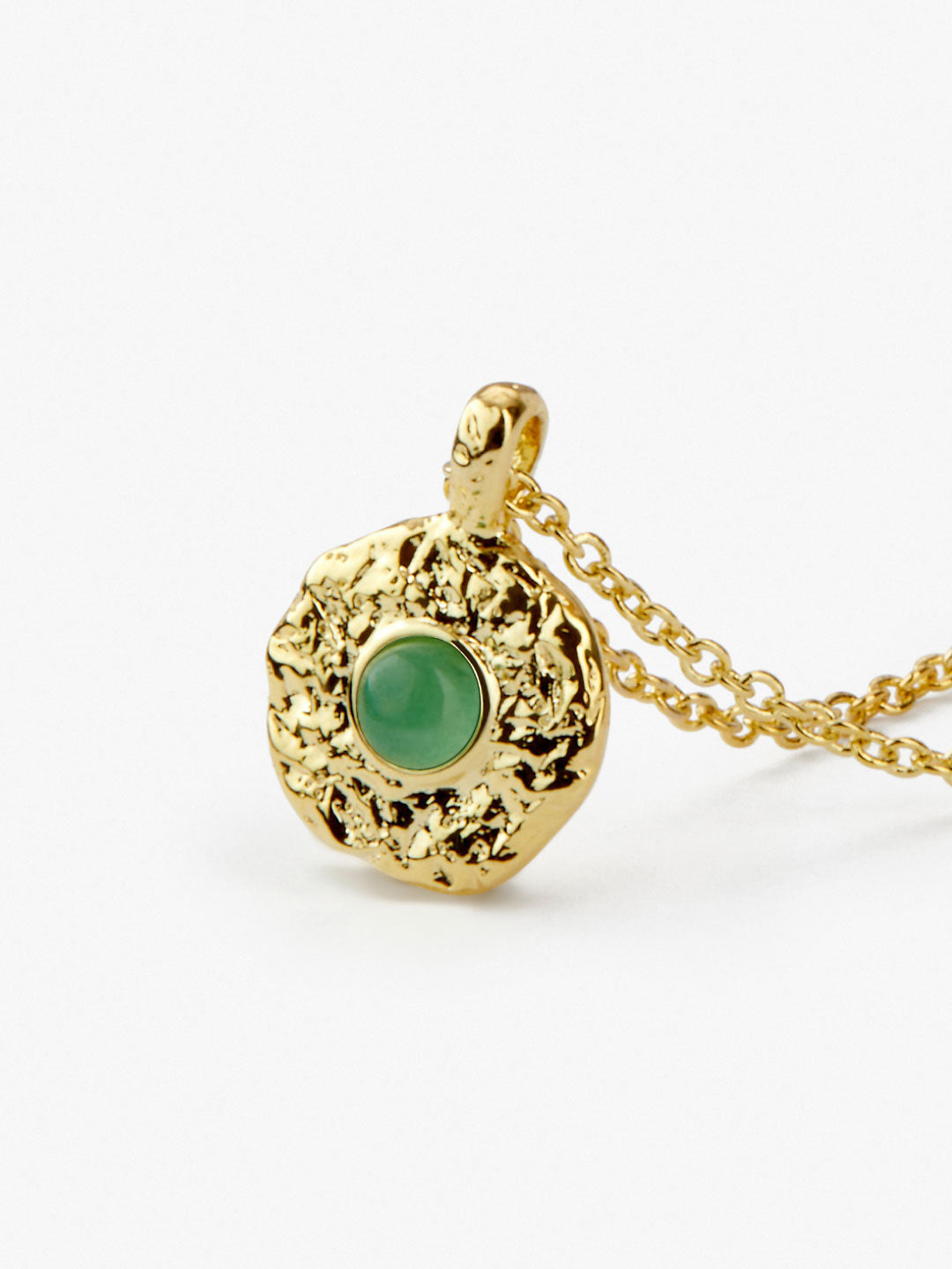 This gorgeous, gold pendant necklace was made in collaboration with influencer couple, Todol. It features a 14k gold-plated pendant and stunning green Aventurine stone, strung along a dainty chain. This gold pendant necklace goes with anything and adds the perfect pop of color. Pair it with our bestselling Harley hoops or our Stephanie ring for a truly special ensemble.