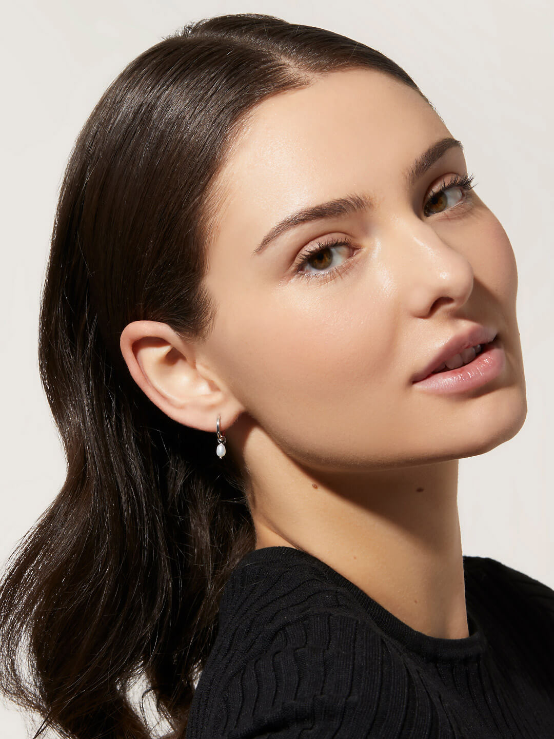 We heard you wanted our Frida Pearl Huggie Hoops in silver? You got it. These silver huggie hoop earrings feature two freshwater pearls that fall just at their center of gravity—the perfect piece for a minimalist that wants to add a little extra “oomph” to their outfit. Wear these pearl huggie hoops alone or pair them with other silver gems like our Mini Huggie Hoops Silver.