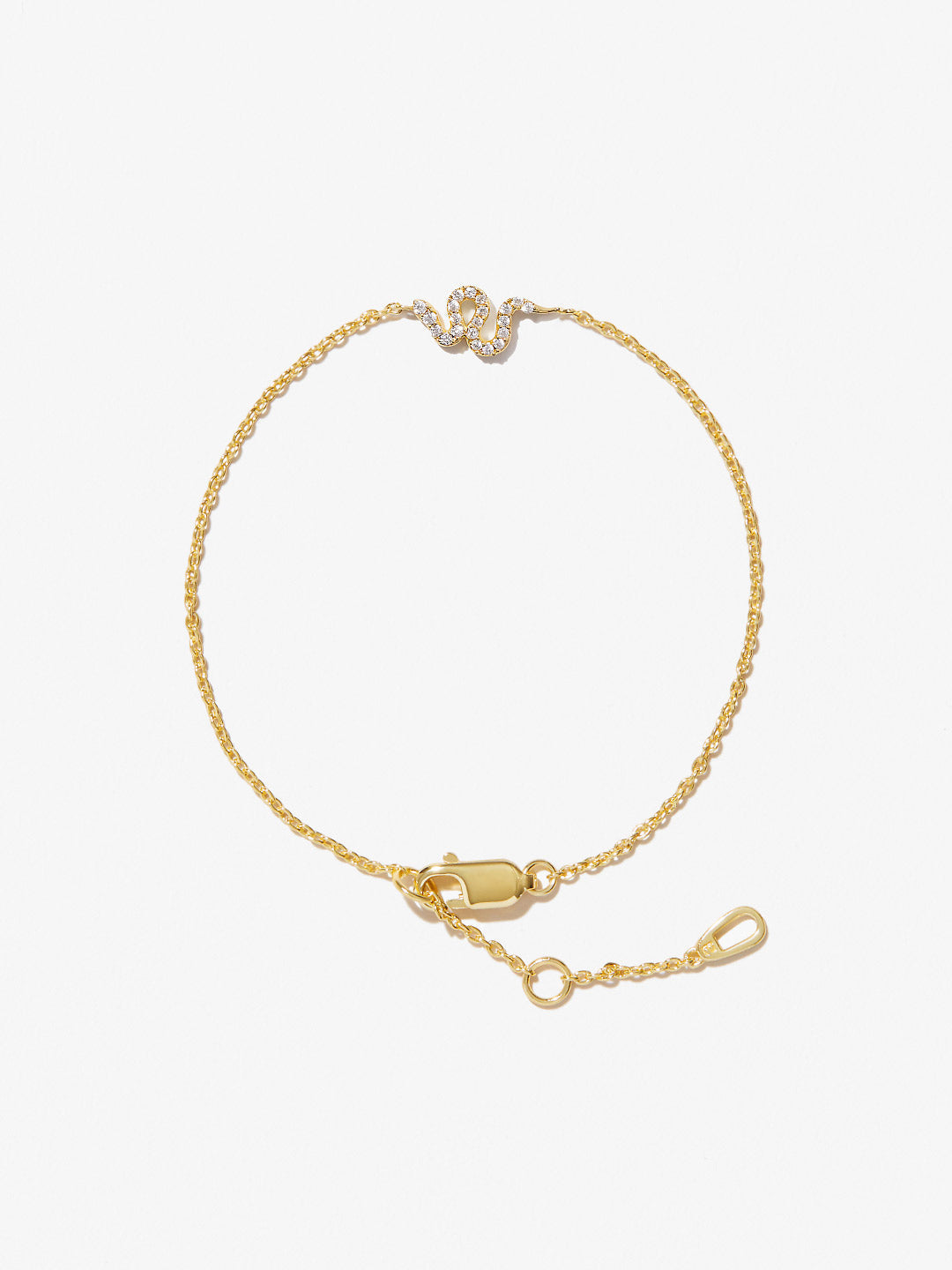 Serpents have been on our jewelry mood board for quite some time, so we had to make this snake bracelet for you. This dainty bracelet is dipped in a layer of 14K gold and features a cubic zirconia encrusted snake in the middle of the chain. Wear this snake bracelet with our Boa earrings to complete your look.