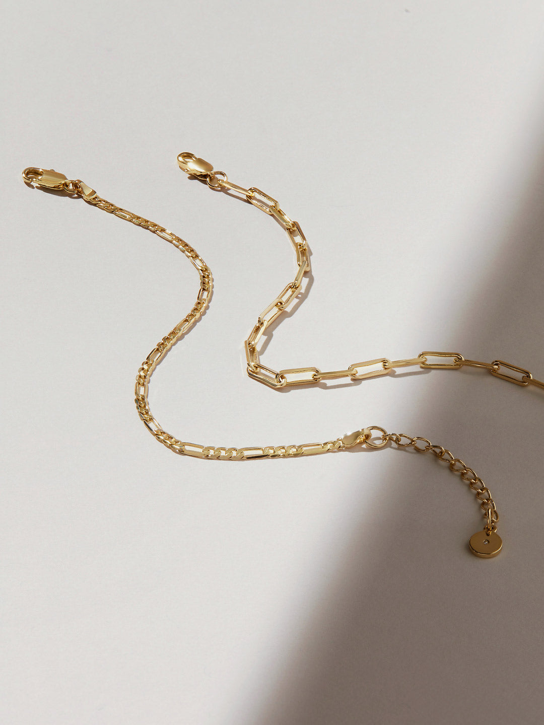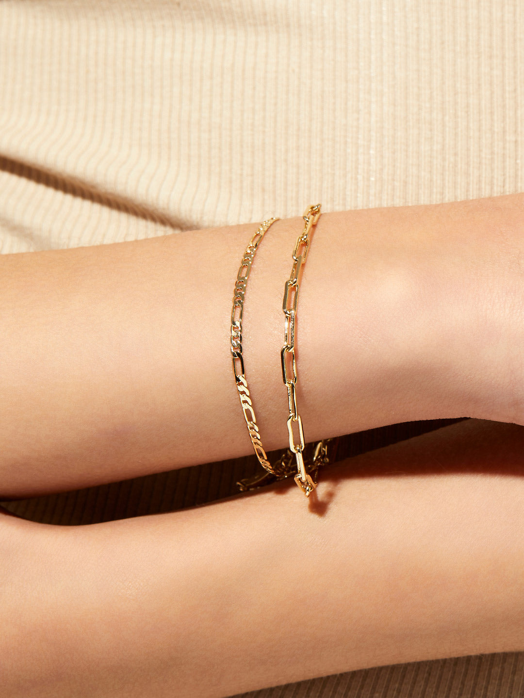 The Bracelet Duo Bundle includes two pieces: Link Chain Bracelet - Poetry Slim, Figaro Chain Bracelet - Elijah Regular. This item is not a Gift Set—gifting packaging is not included but can be sold separately.