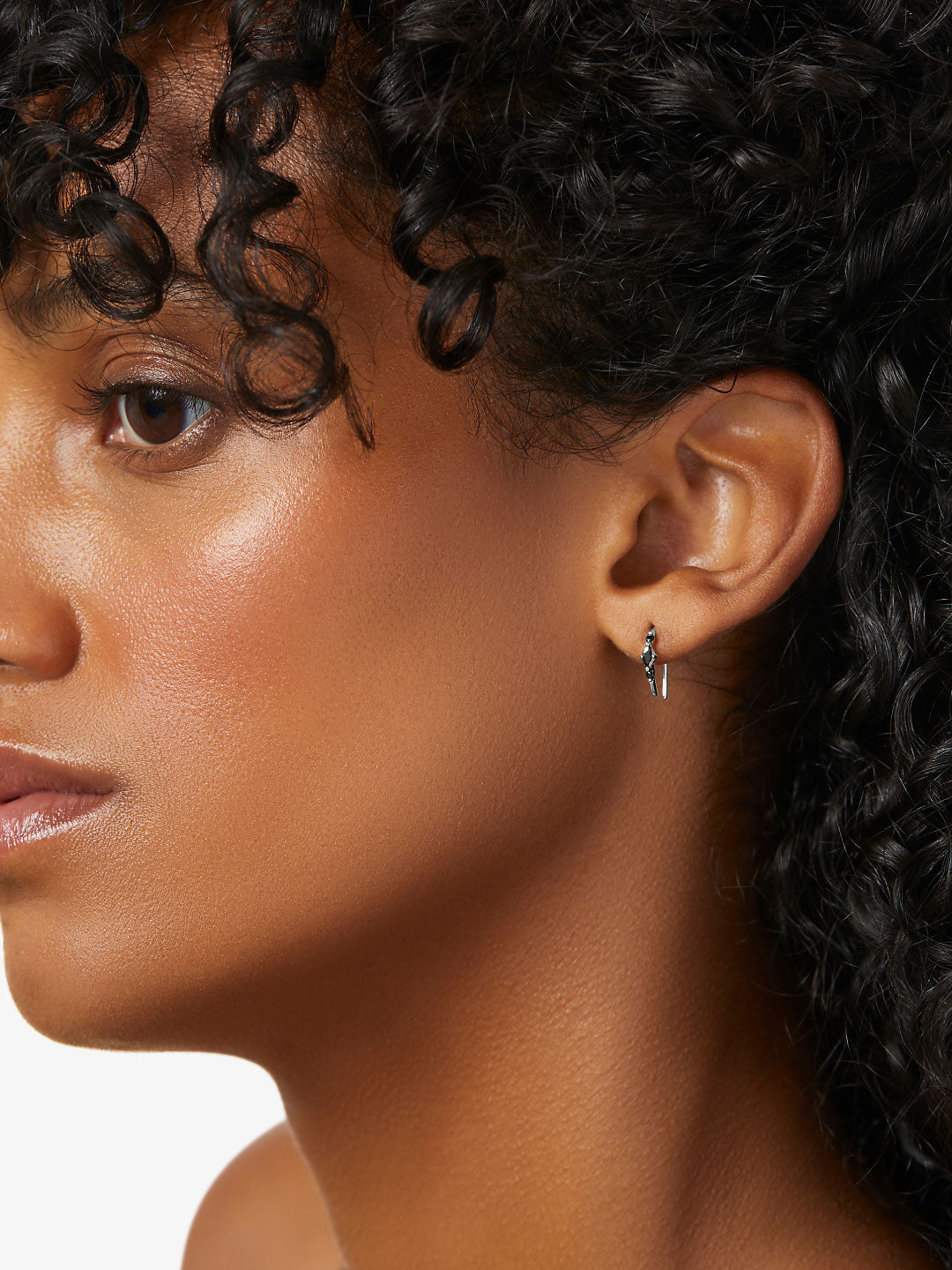 Say hello to our open hoop earrings now in stunning silver with black gems. These open back hoops are dotted with alluring black cubic zirconia stones, destined to take your look to the next level. Chic, cool, and effortless. these open hoop earrings pair well with Heritage Silver necklace.