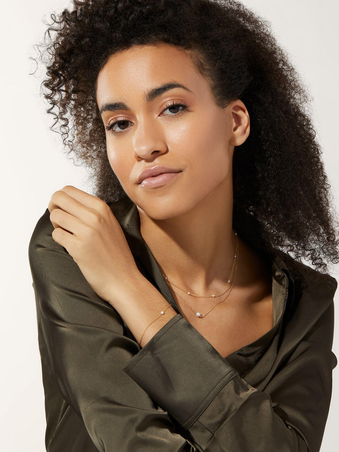 Embrace the 1980’s but in a chic, modern way with this dainty pearl necklace. This simple 14K gold-dipped sterling silver chain necklace puts a single freshwater pearl on display for the world to see. Wear our Lacey pearl necklace alone for cocktail and dinner parties or pile on the neckwear layers for a bold necklace stack.