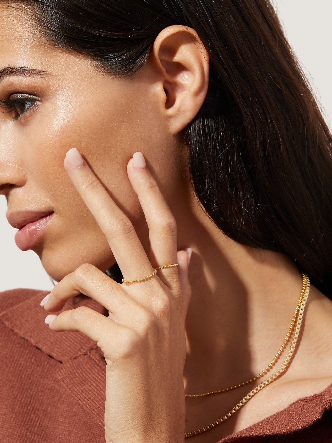 This delicate ball chain ring is crafted in recycled Sterling Silver and dipped in 14K gold. The design flawlessly flows into the band - creating an elegant piece that is great to stack with other rings. Pair this gorgeous ball chain ring with the matching bracelet and necklace from our collection to create a cohesive look.