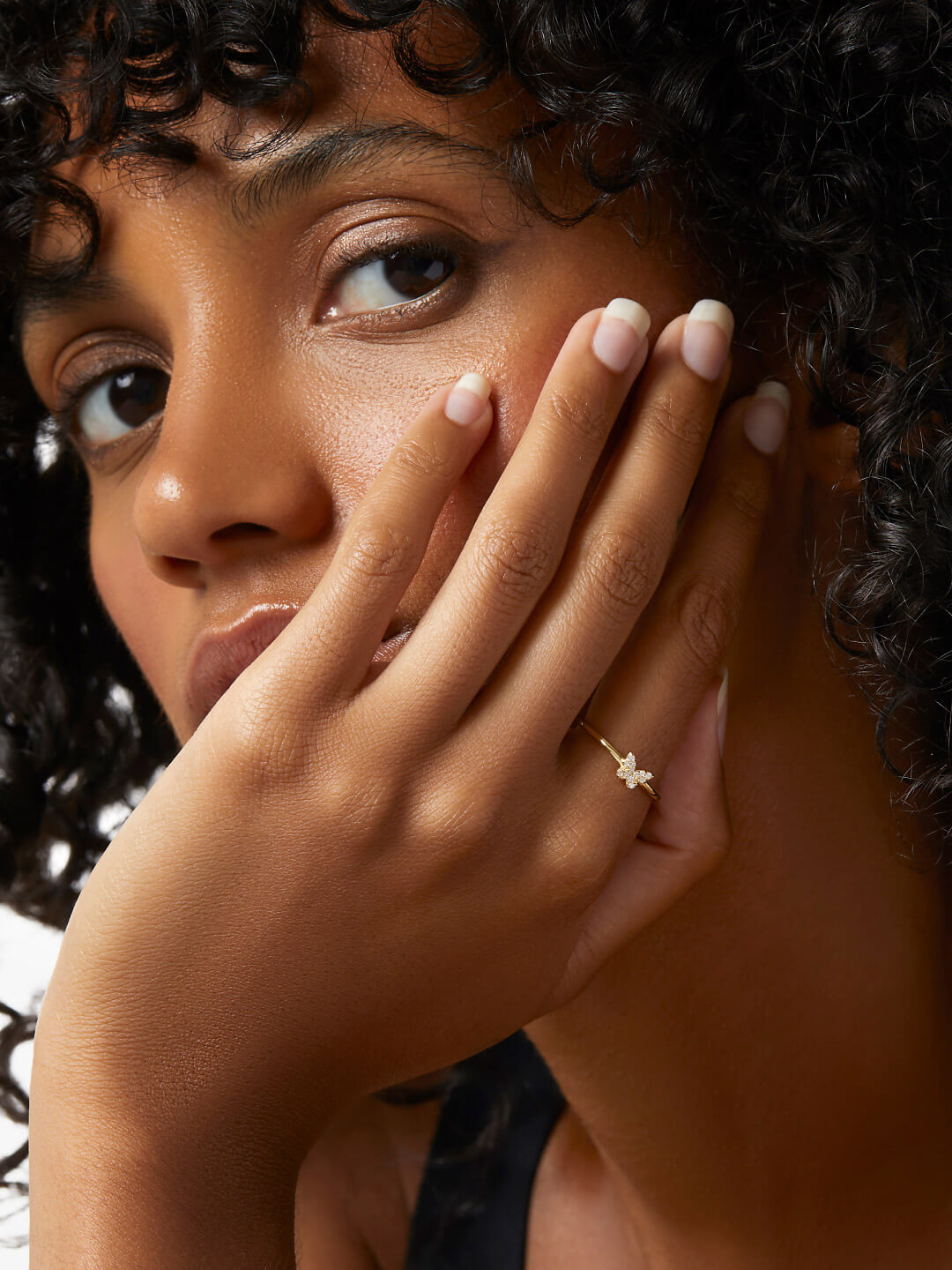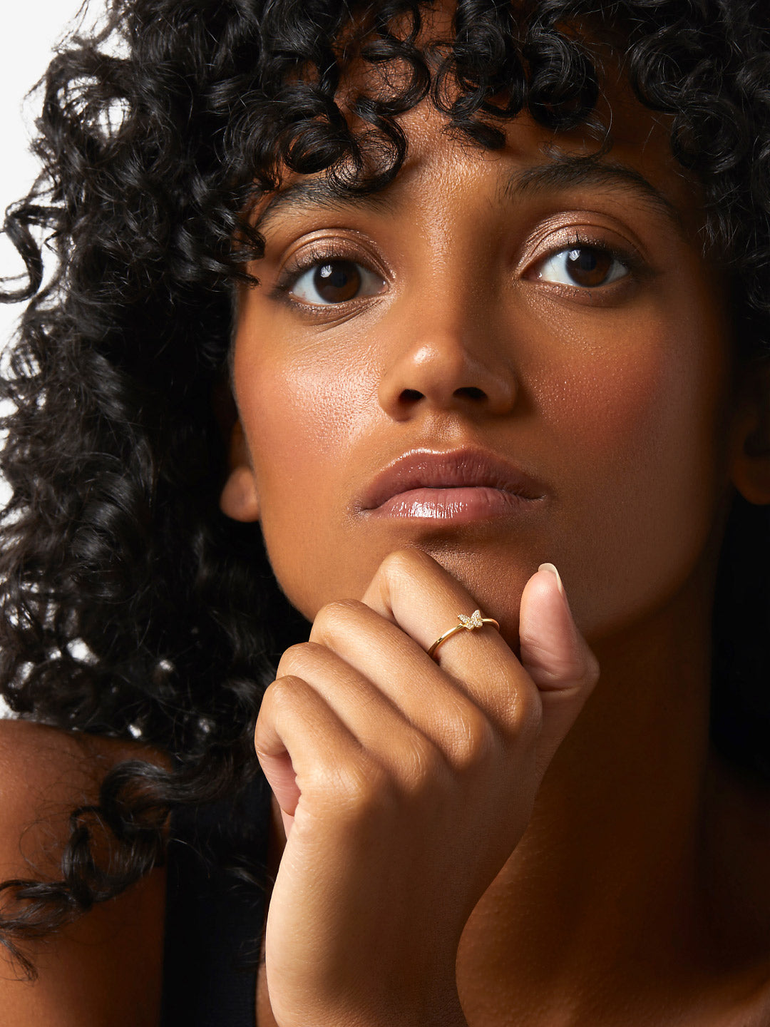 Butterflies are often seen as symbols of transformation, and this butterfly ring will surely transform your everyday ring stack. This delicate ring is crafted in sterling silver, dipped in 14K gold, and set with cubic zirconia gemstones for an added touch of sparkle. Wear this butterfly ring alone or amp up the sparkle by pairing it with our Maya earrings.