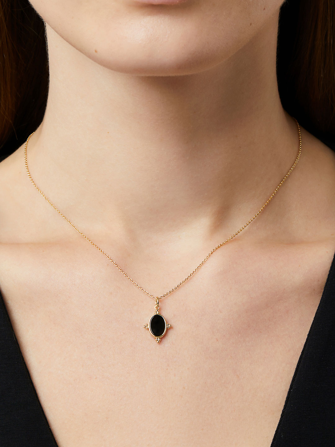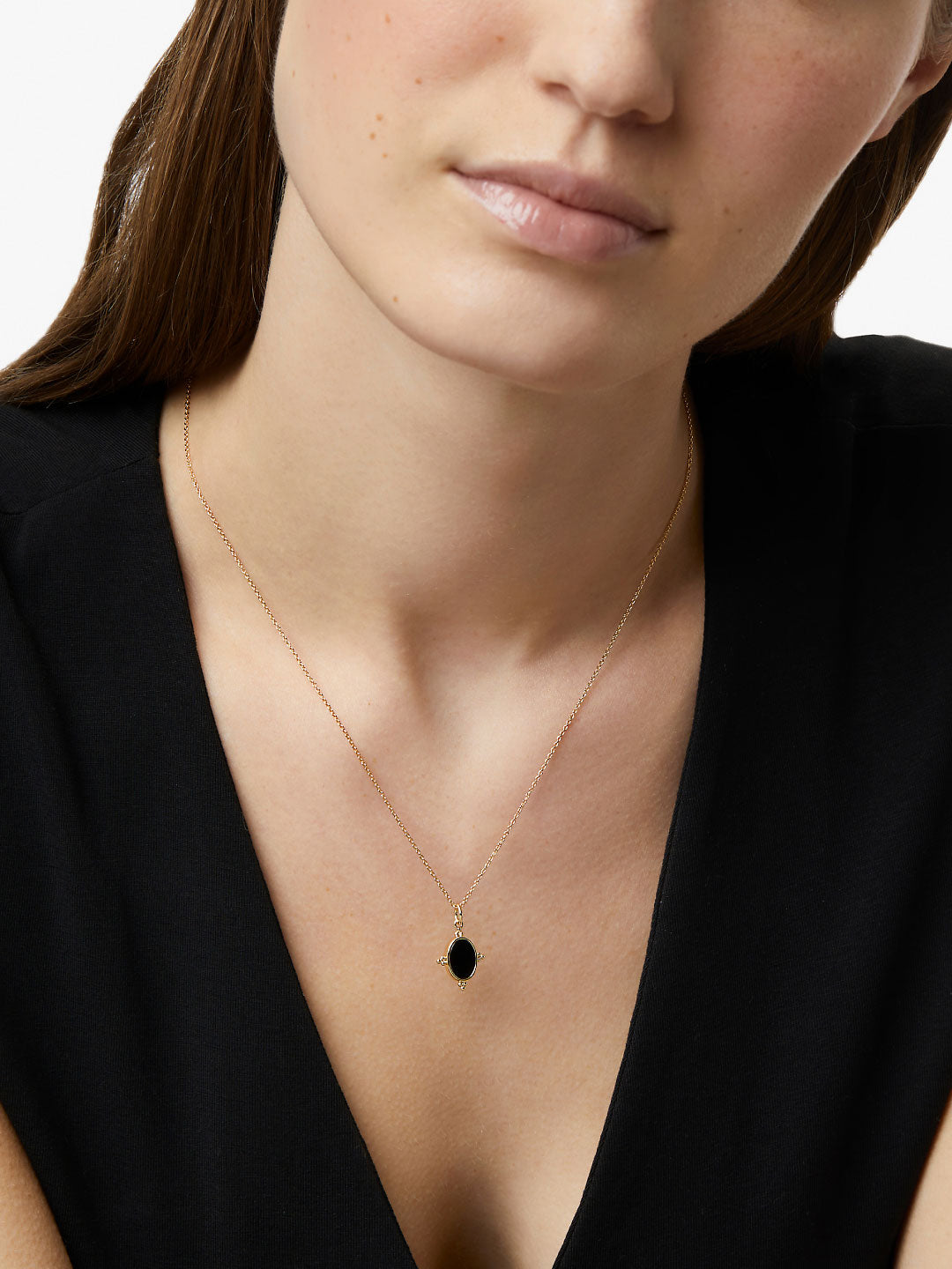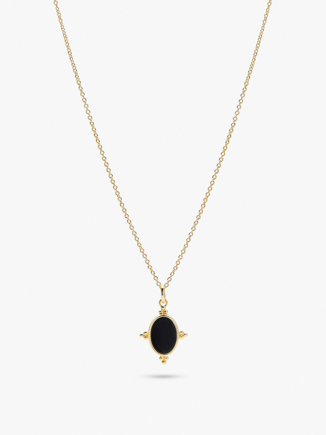 The inserted black onyx of this necklace seems to peek into the infinite, drawing the attention of any passersby. This beautiful gold-dipped Emerson necklace gives equal parts mystery and elegance. It’s a beautiful solo statement piece that can tie any look together.
