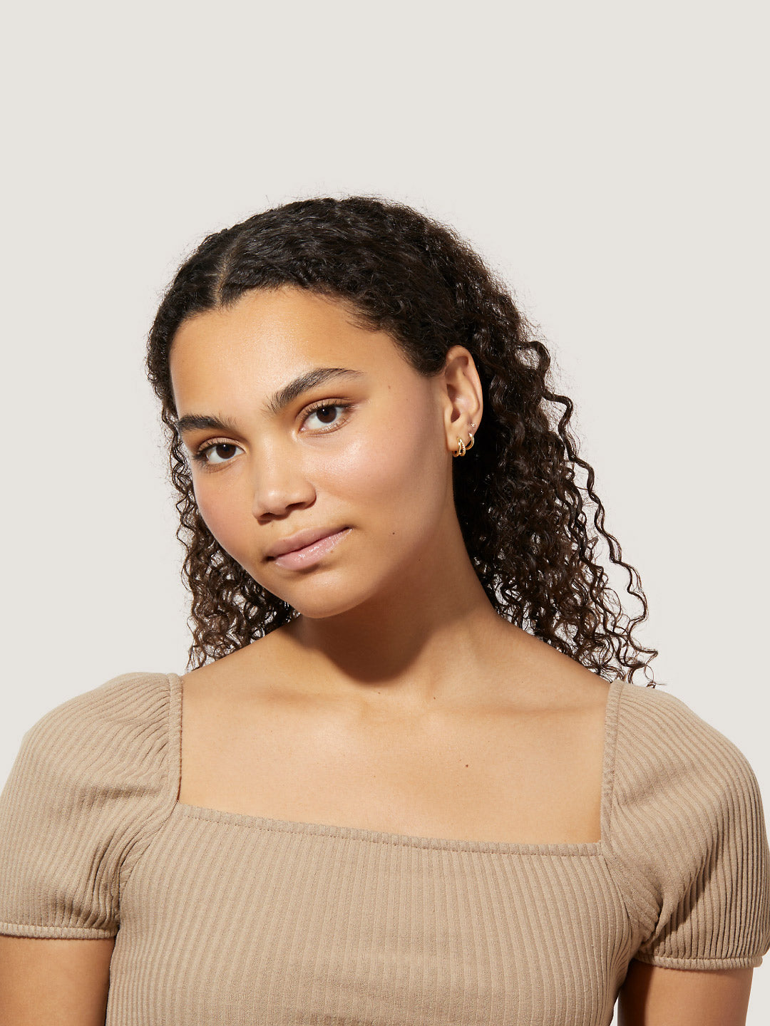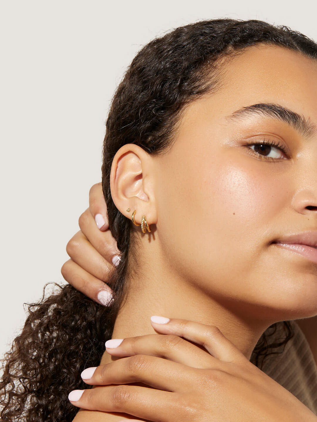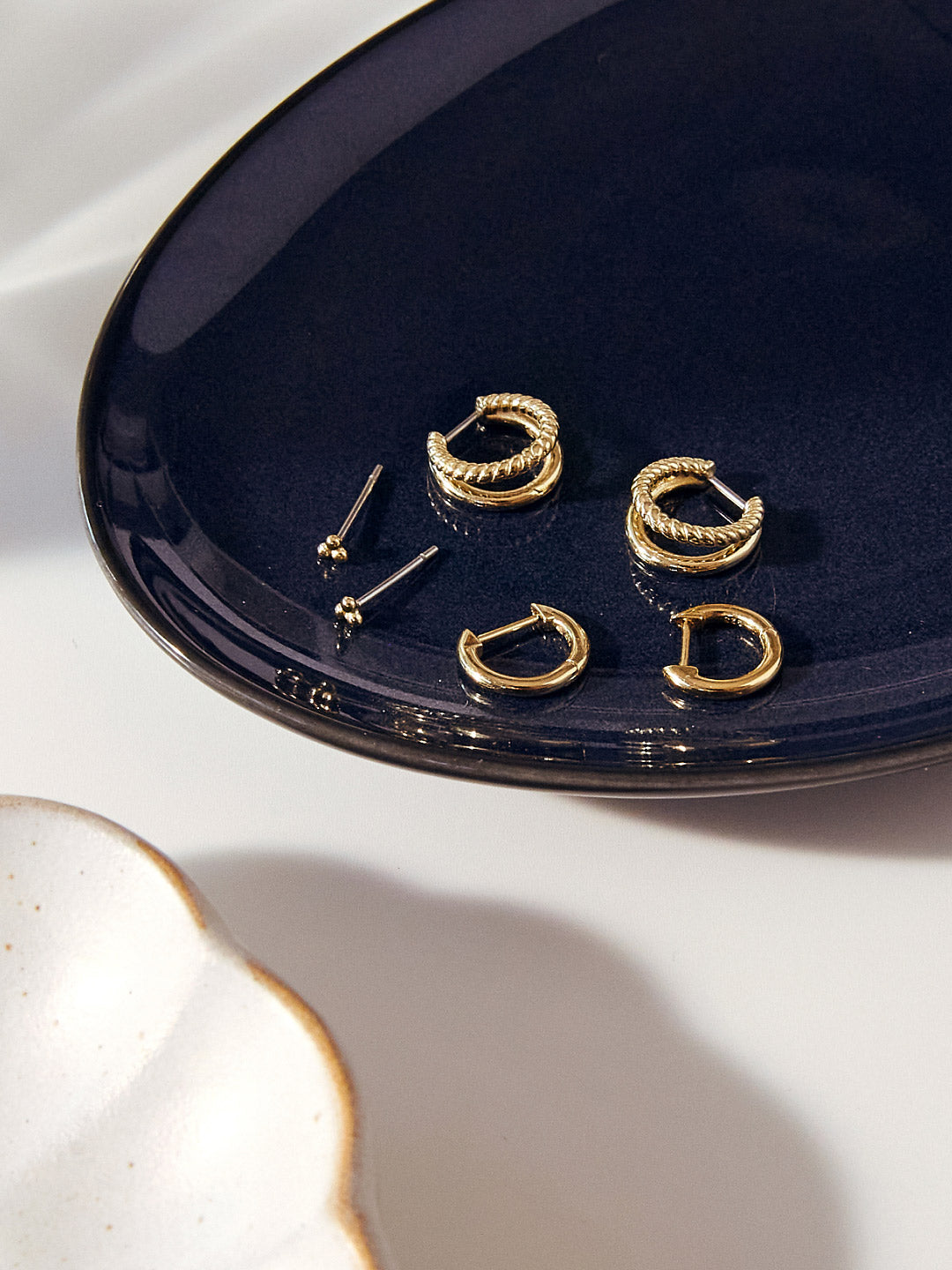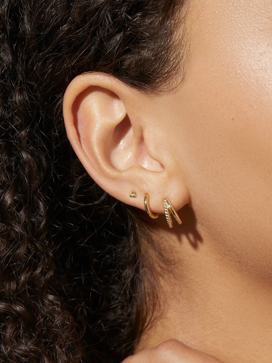 The Perfect Stack Bundle includes three pieces: Small Hoop Earrings - Jesse, Mini Huggie Hoops, and Beaded Stud Earrings - Tiva. This item is not a Gift Set—gifting packaging is not included but can be sold separately.
